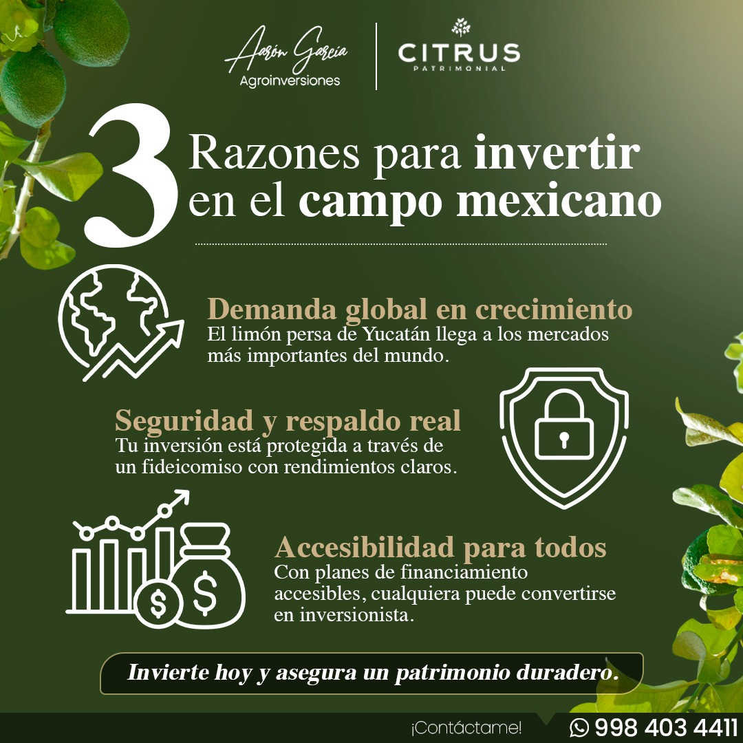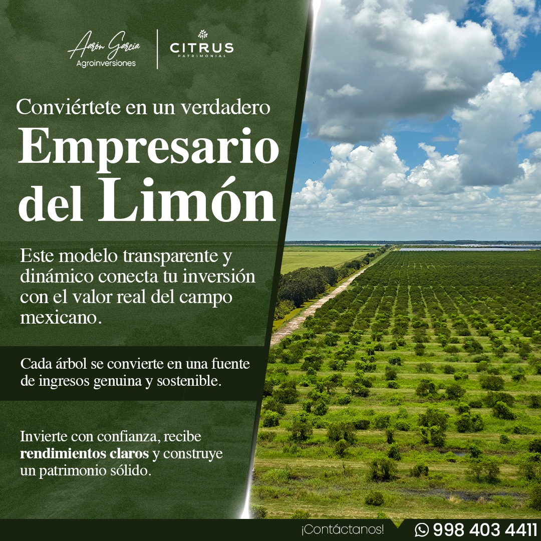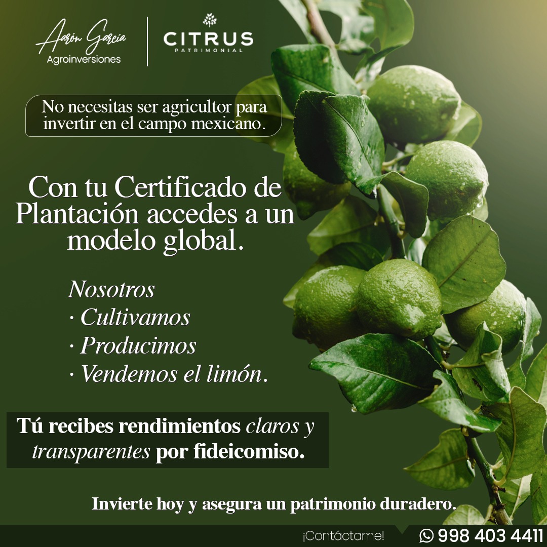 Citrus Patrimonial es una empresa dedicada a la producción, cultivo y comercialización de limón persa, ofreciendo un modelo de inversión respaldado por fideicomiso que permite a cualquier persona convertirse en inversionista del campo mexicano. A través de los Certificados de Plantación, sus clientes acceden a un esquema confiable, transparente y con rendimientos reales derivados de una actividad agrícola sostenible.