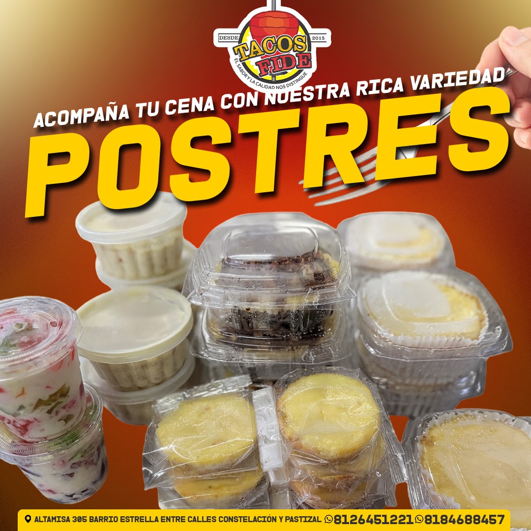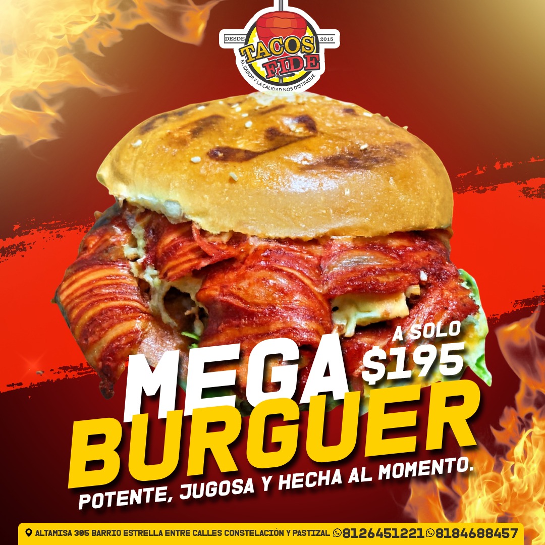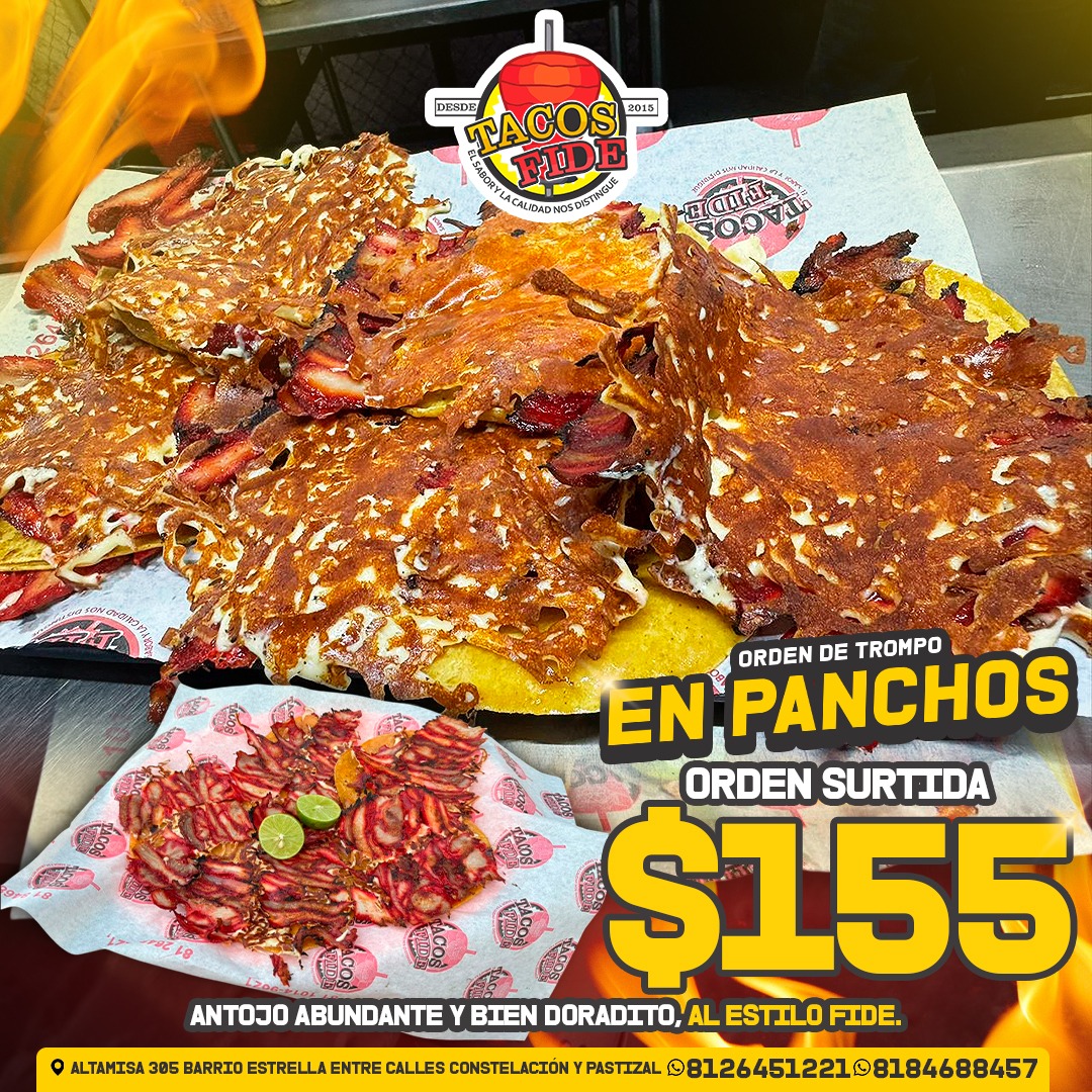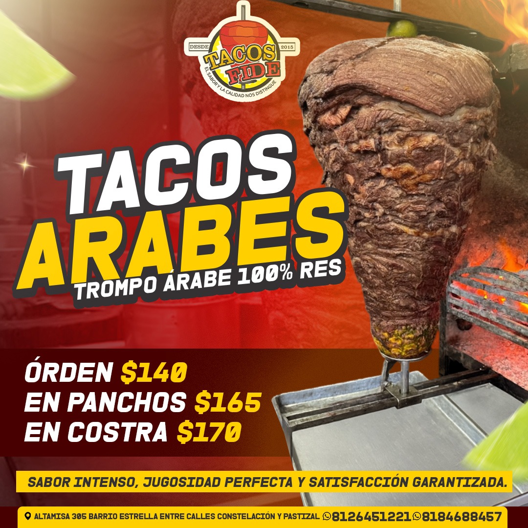 Tacos Fide es un lugar emblemático en Monterrey, conocido por su trompo árabe 100% res, sus órdenes abundantes y su inigualable sazón norteño. Desde tacos tradicionales hasta especialidades como la Mega Burguer y los famosos “panchos”, Tacos Fide se distingue por ofrecer porciones generosas, ingredientes frescos y el sabor intenso que ha convertido a este spot en un favorito de la zona. Además, cuentan con una amplia variedad de postres caseros para cerrar la experiencia con el toque dulce perfecto.